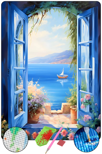 Mavi pencere ve deniz manzarası sayılarla boyama elmas hobi seti