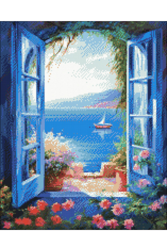 • Mavi pencere ve deniz manzarası sayılarla boyama elmas hobi seti